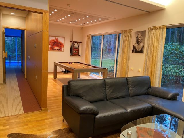 Закрытый частный бассейн с подогревом, гидромассажем и традиционная сауна — это идеальное место для расслабления в любое время года. На первом этаже расположена просторная гостиная с камином, оборудованная кухня и уютная SPA-зона c бильярдом и зоной для отдыха с выходом на террасу. На террасе есть зона для барбекю, где можно приятно проводить летние вечера. В августе во дворе можно собирать лесную чернику прямо к завтраку.